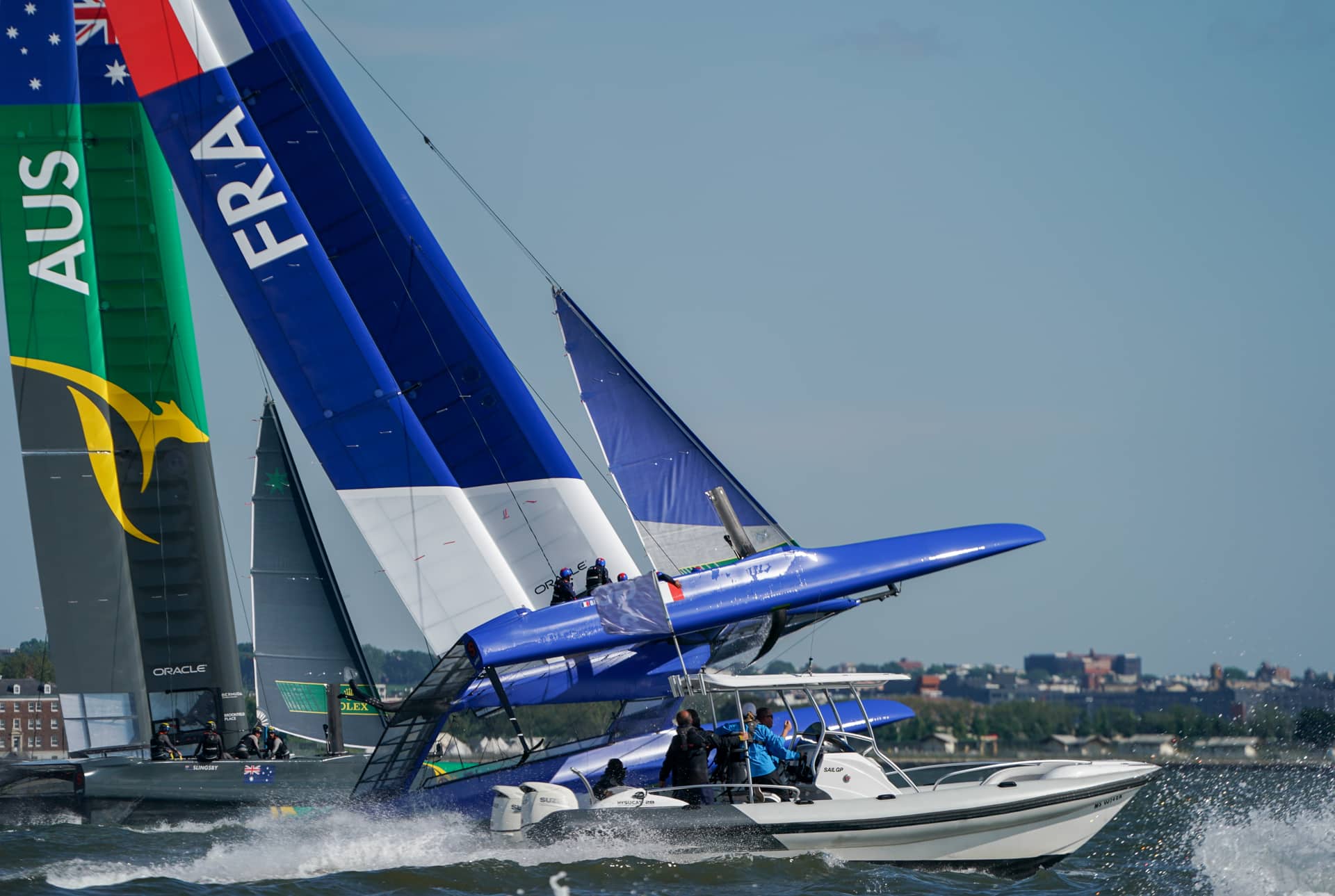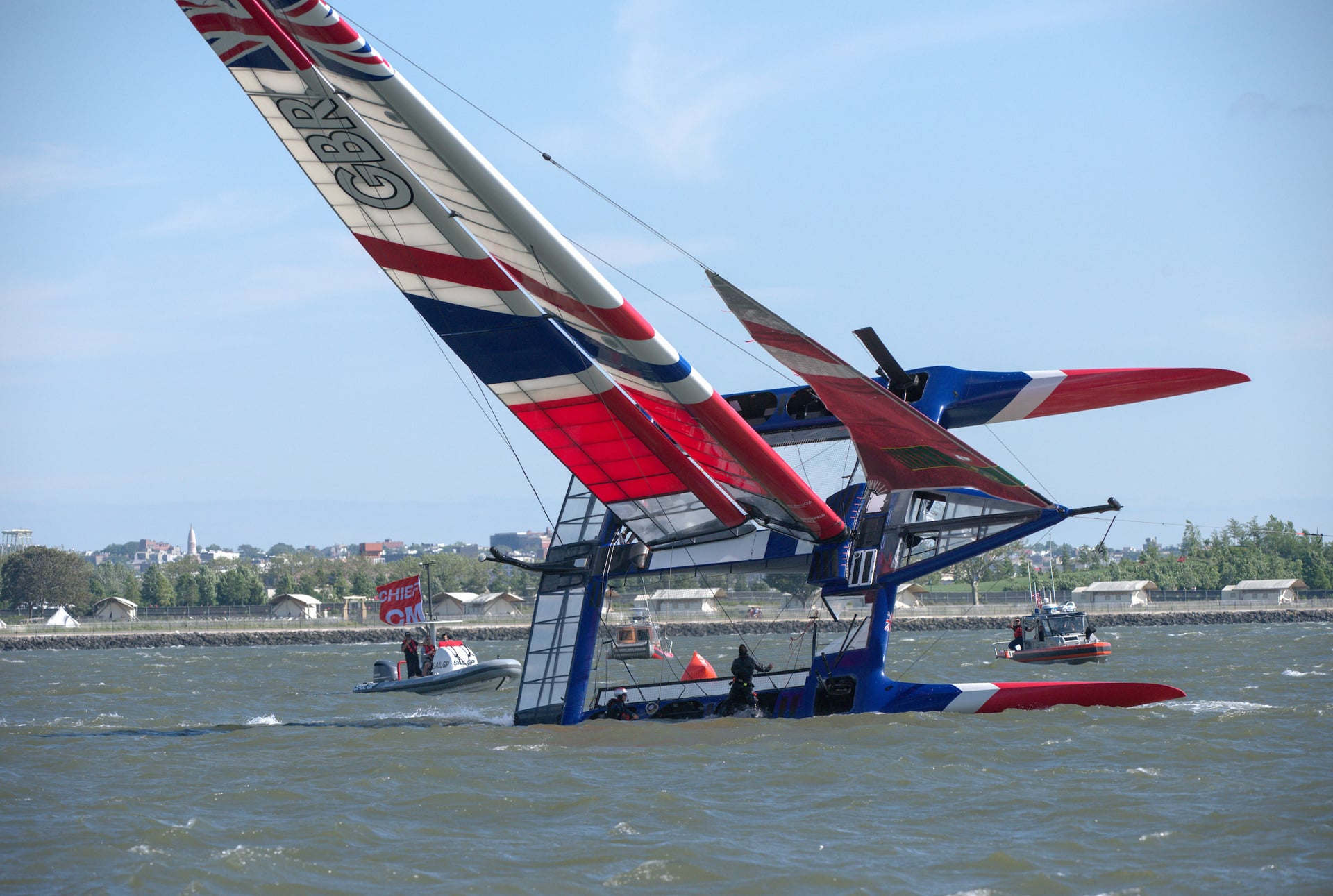 Après une semaine new yorkaise passée sous la pluie battante et avec seulement quelques demi-journées d’entraînement sur le plan d’eau de la « grosse pomme », les six équipes de SailGP s’attendaient à une entrée en piste musclée ce vendredi. Ils n’ont pas été déçus. Les Anglais ont d’abord chaviré à l’entraînement, peu de temps avant le lancement des régates. Pas de blessé mais des dégâts matériels sur l’aile, privant les Britanniques de ce premier jour de compétition.