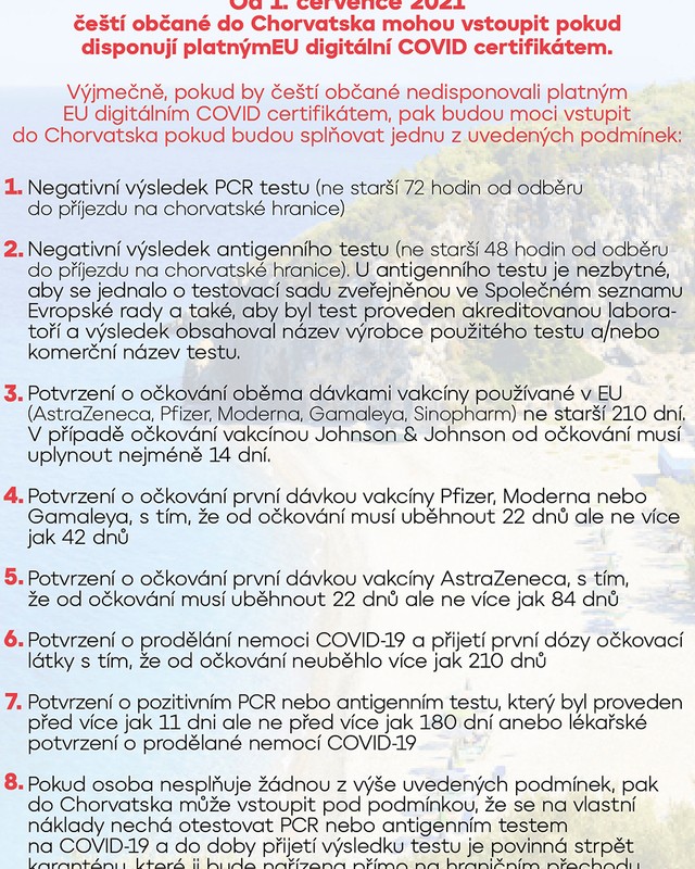 Chorvatsko od čtvrtka zásadně mění podmínky pro vstup do země. Nově je potřeba covid pas prokazující očkování na covid či prodělání nemoci nebo negativní test na koronavirus. Cestování do Chorvatska bylo přitom od půlky června pro cestující z Česka bez omezení, stačil pouze občanský průkaz nebo cestovní pas.