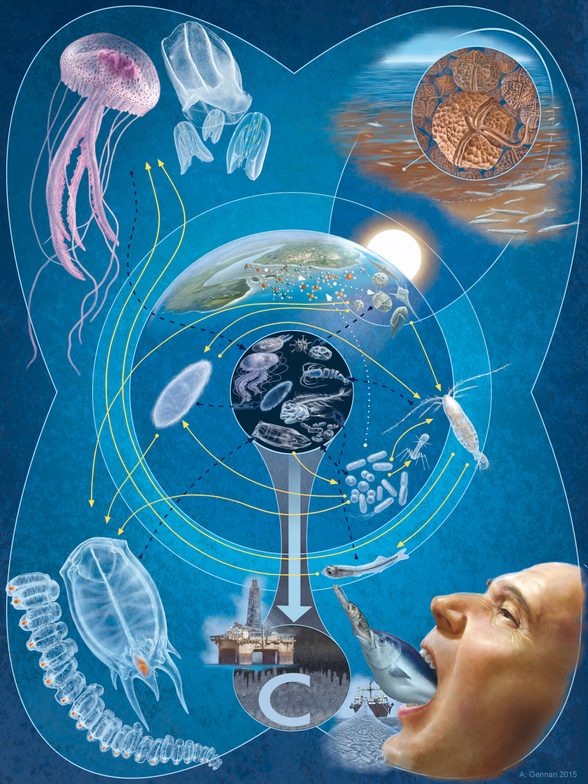 Questa è la via microbi, copepodi, pesci… noi. Una terza via, in basso a sinistra, è costituita dal macrozooplancton gelatinoso erbivoro. Si tratta di animali di cui il pubblico ha poca familiarità (avete mai sentito parlare di taliacei?) ma che, quando sono molto abbondanti, possono mangiarsi tutti i microbi, competendo con i copepodi e, indirettamente, anche con noi. In alto a sinistra troviamo il macrozooplancton gelatinoso carnivoro, che tutti conoscono: le meduse (e anche gli ctenofori, che non conosce nessuno). Loro mangiano i copepodi e le larve dei pesci. Dal nucleo microbico, quindi, partono quattro vie. C’è anche il sequestro del carbonio, nei sedimenti marini.