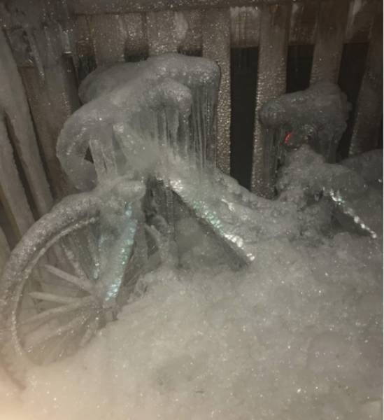 22. Обледенелый велосипед после зимней бури в Чикаго