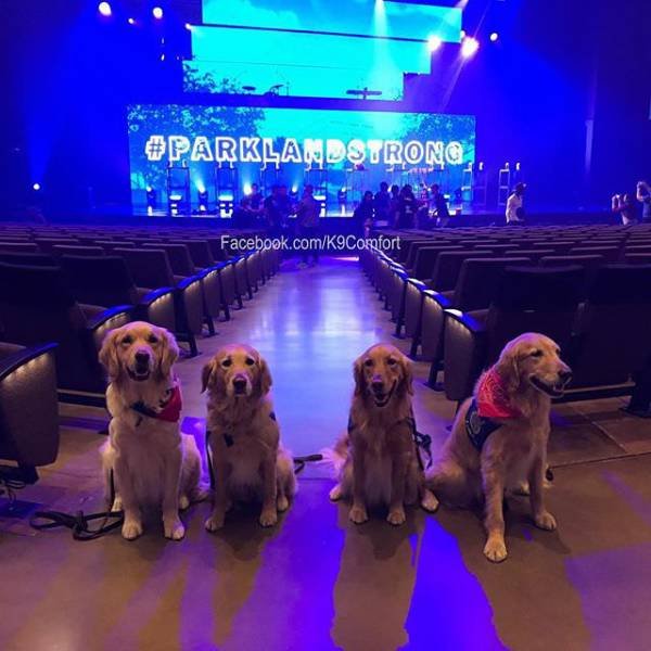 1. Несколько из 19 собак-терапевтов из группы LCC K-9 Comfort Dogs, которые в настоящее время находятся в Паркленде (Parkland), штат Флорида, чтобы оказывать поддержку людям