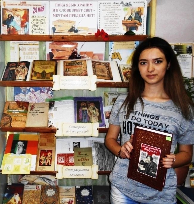 Издания, представленные в разделах выставки «Первоучители добра, вероучители народа», «Сотворенье азбуки русской» и «Славянского слова узорная вязь» знакомят читателей с историей письма и русской книжности, рассказывают о богатстве русского языка и уникальности славянского фольклора, о жизни и деятельности великих славянских просветителей. О пребывании Константина (Кирилла) Философа и его брата и соратника Мефодия в 861 году в Крыму, в Херсонесе (Корсуни), повествуют издания «Как Кирилл и Мефодий азбуку писали» и «Легенды, были и сказки Крыма для детей» Е. Белоусова, книги Ю. Могаричева «Средневековый Крым: история, религия, культура» и «Православные святые Средневековой Тавриды». По мнению краеведов, в 863 году, после пребывания в Херсонесе, Константин с помощью брата принялся за главное дело своей жизни – составление славянской азбуки и перевод на славянский язык Священного Писания и богослужебных книг. Образы Кирилла и Мефодия увековечены на памятнике «Тысячелетие России» в Великом Новгороде, им установлены памятники в Москве, Мурманске, Самаре, Владивостоке, Коломне, Твери, Смоленске, Ханты-Мансийске, Саратове, Севастополе, Череповце, Дмитрове, Черкесске, Липецке.