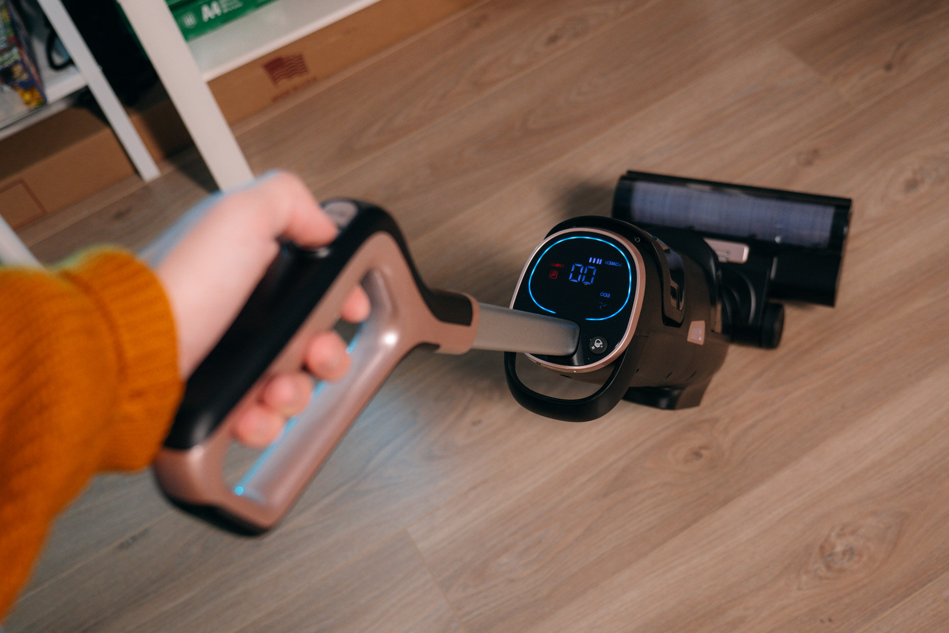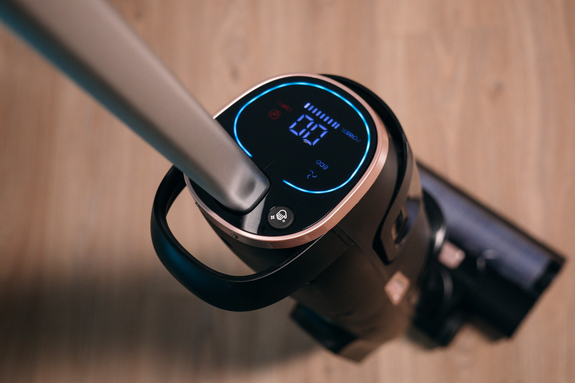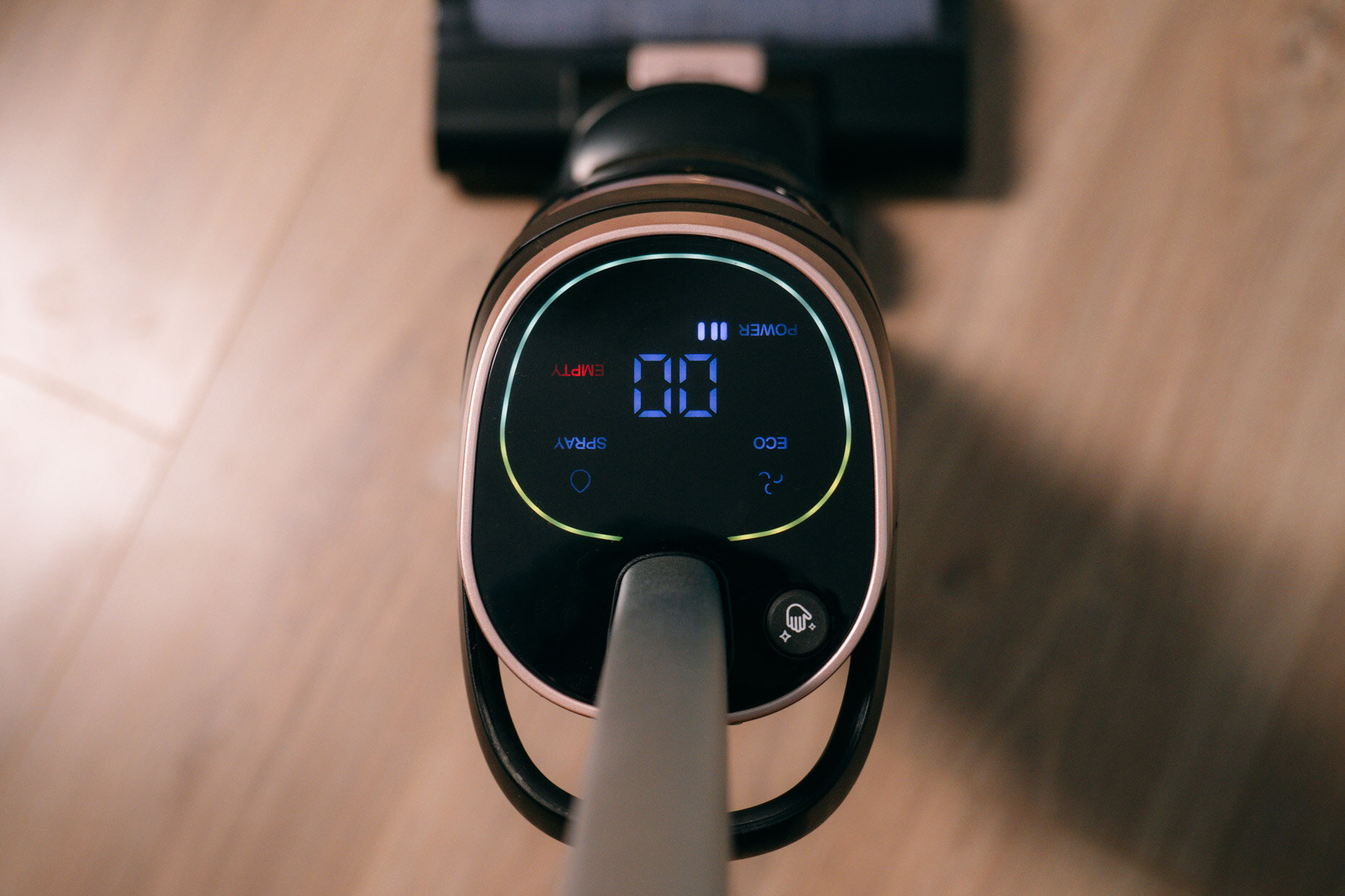 Опустив взгляд во время уборки, вы увидите информативный дисплей, к которому, впрочем, у меня есть претензия. Почему он расположен вверх ногами? Чтобы рассмотреть, какой режим включен в данный момент, приходится мысленно переворачивать надписи во время чтения.