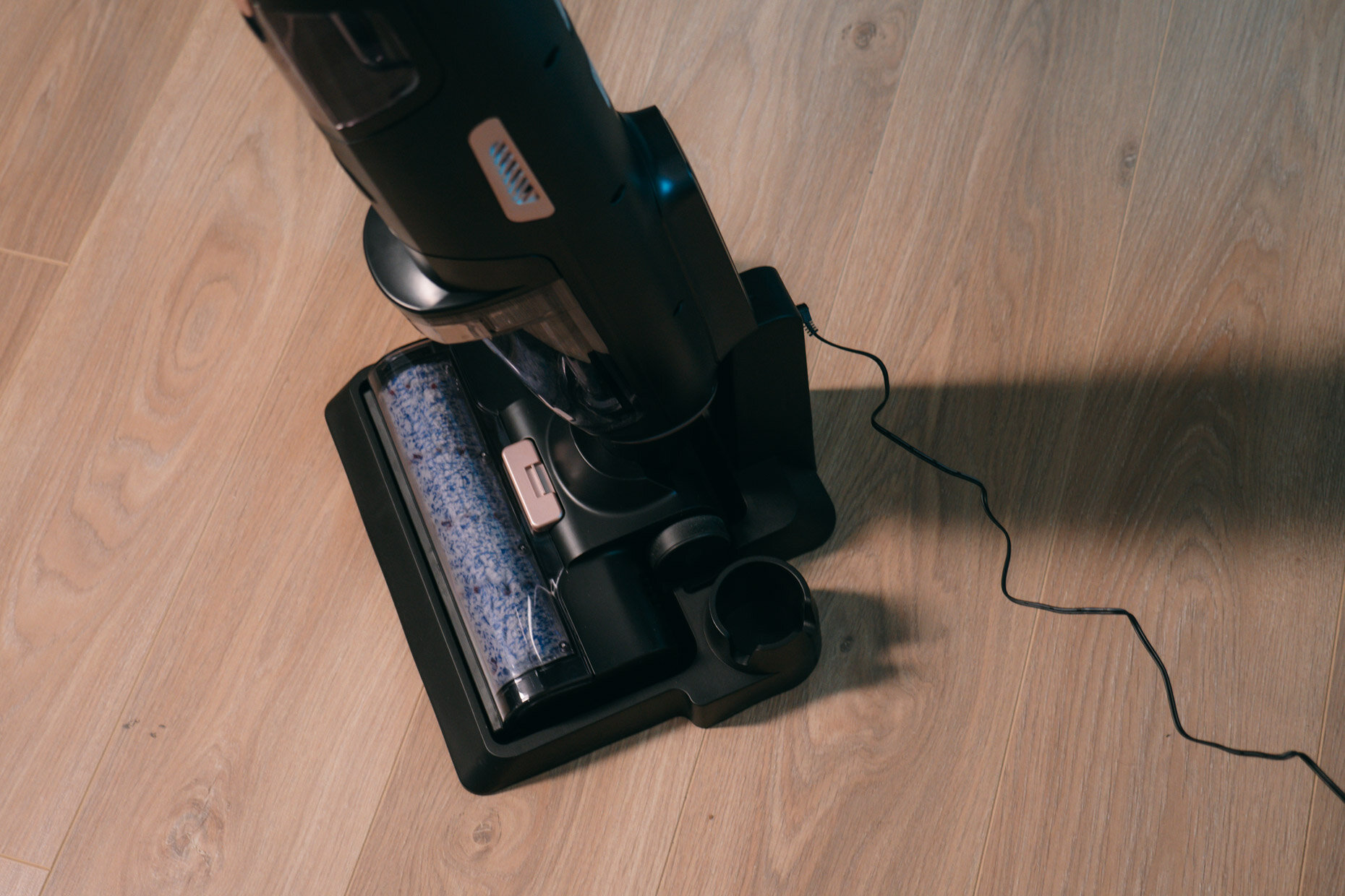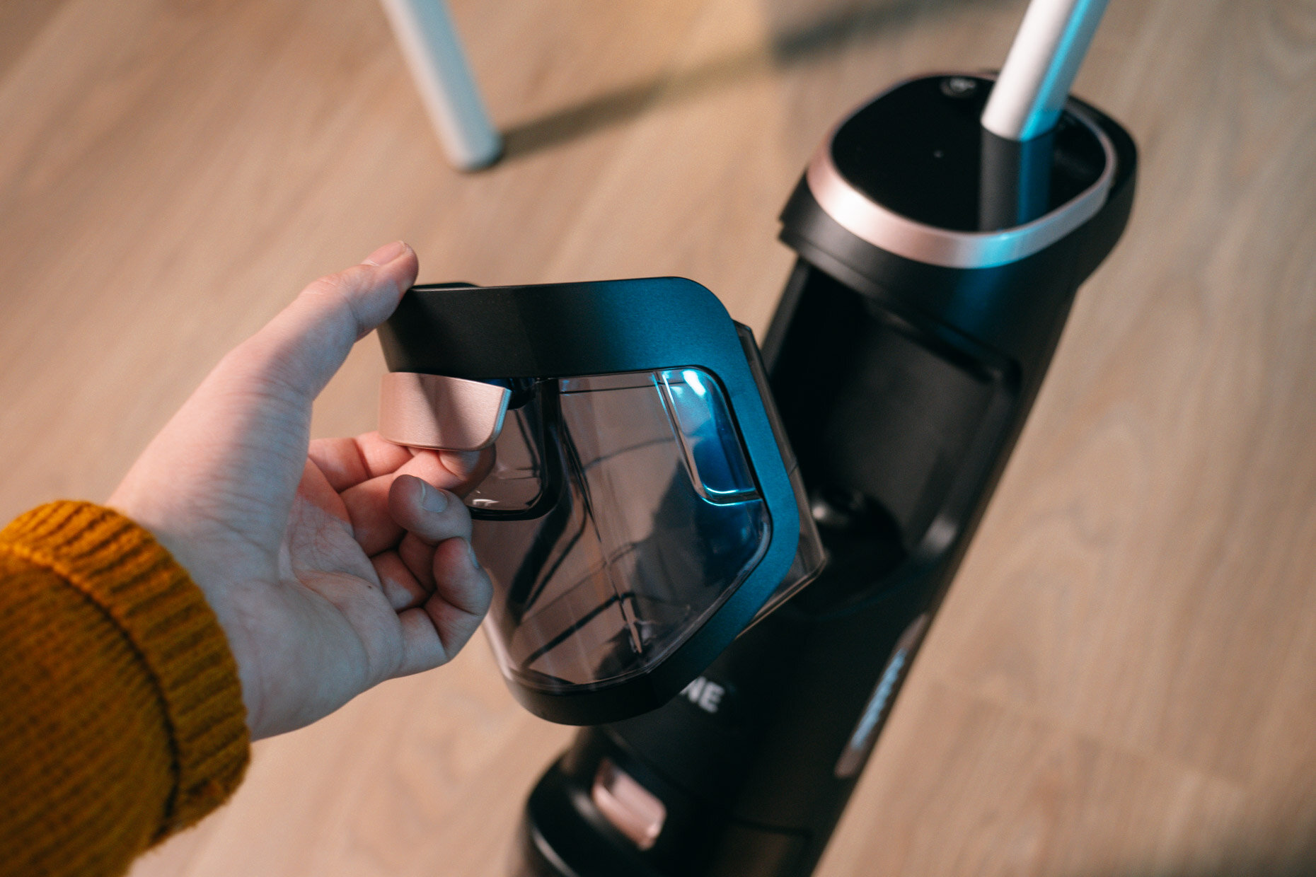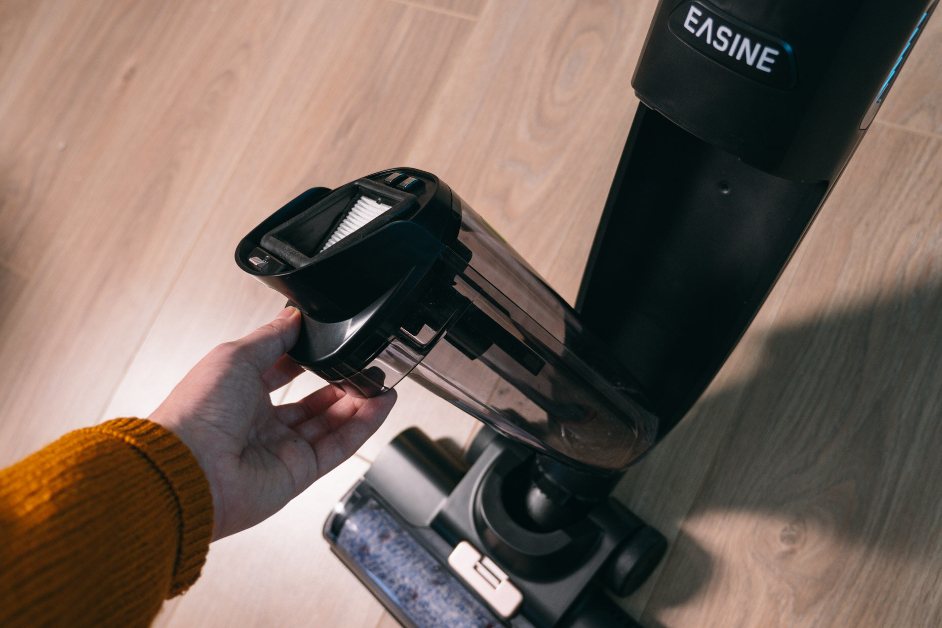 ILIFE EASINE W100 позволяет проводить уборку в трех режимах: сухая, влажная и мытье. И если с обычным всасыванием пыли все понятно, то вот о двух других типах уборки стоит поговорить отдельно. Во время влажной уборки пользователь вручную контролирует количество разбрызгиваемой воды, нажимая кнопку на ручке пылесоса. Это удобно, если вы заметили на полу какое-то конкретное пятно. Если же вы хотите полноценно помыть полы, следует нажать кнопку с пиктограммой руки возле дисплея пылесоса. Это активирует сложную систему очистки: чистая вода из верхнего бака поступает к валику, а собираемая грязь всасывается в емкость, расположенную ниже. Эта же кнопка позволяет пылесосу совершать самоочистку.