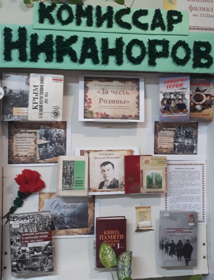 В симферопольской библиотеке-филиале №7 им. Т.Г. Шевченко для читателей, представлена постоянно действующая краеведческая выставка «За честь Родины», посвящённая комиссару В.И. Никанорову и партизанам Крыма. Читатели могут познакомиться с литературой о партизанском движении в Крыму в годы Великой Отечественной войны. В первой рубрике «Комиссар Никаноров» представлен - портрет Василия Ивановича и архивное сообщение для читателей, где описана его краткая биография и жизненный путь. Во второй рубрике «Дорогами памяти» – читатели познакомятся с новыми изданиями из фонда библиотеки «Крымские партизаны и оккупация Крыма в 1941 – 1944 годах», «Партизанское движение в Крыму в период Великой Отечественной войны» и др.