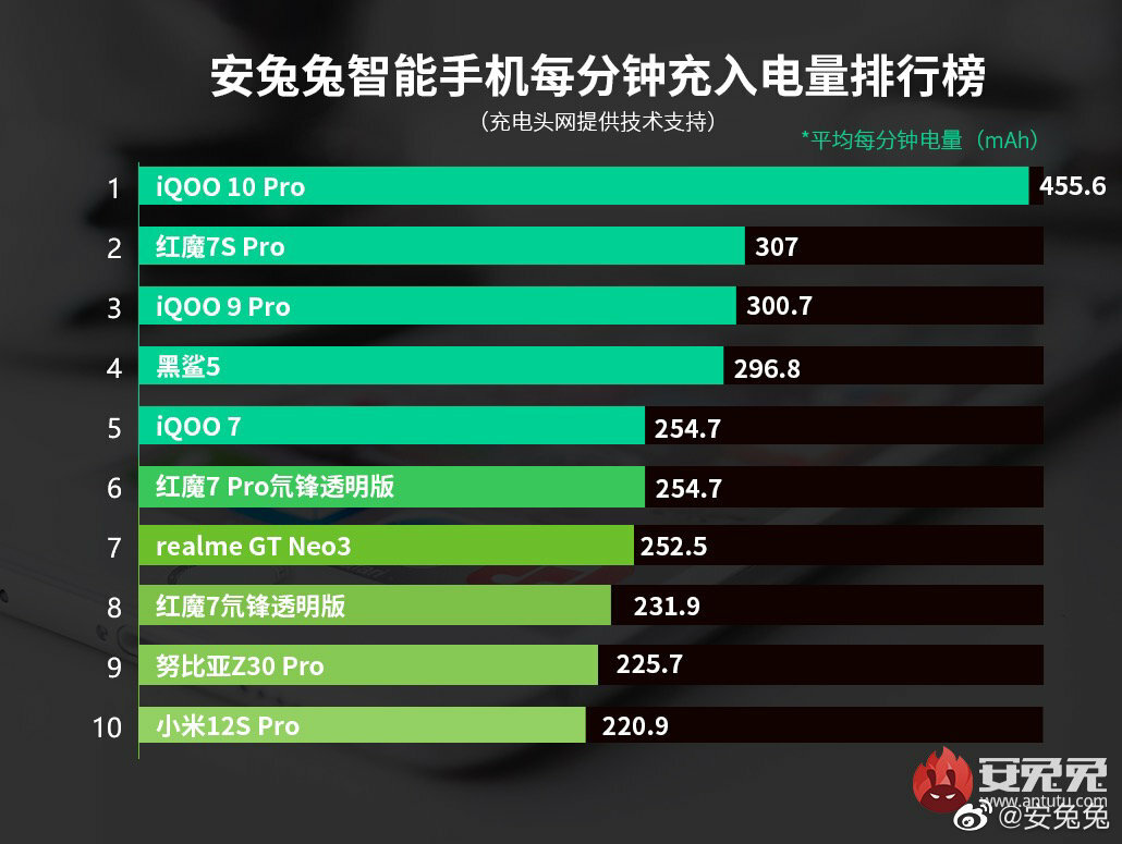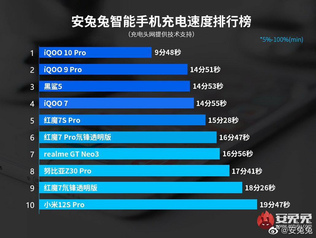 Компания AnTuTu опубликовала топ-10 смартфонов с самой быстрой зарядкой — в рейтинге сравнивается скорость восполнения энергии с 5% до 100%. Лидером стал недавно недавно представленный IQOO 10 Pro с зарядкой на 200 Вт, а на третьем месте, что примечательно, расположился геймерский смартфон Black Shark 5 от Xiaomi — это далеко не флагман, ведь его европейская стоимость составляет 500 евро (премиальные модели гораздо дороже).