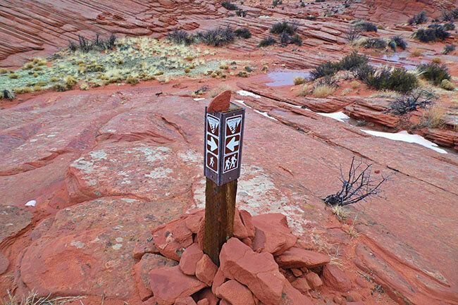 Кое-где расставили невзрачные указатели/ © thewaveaz.comНо, видимо, никакие материальные затраты, никакие добровольные согласия на то, что человек подвергает свою жизнь опасности, не остановят поток туристов к Аризонской волне. С каждым годом желающих все больше и больше и на увеличение квоты с 20 до 64 человек в день администрация решилась именно из-за огромной популярности места. И это с одной стороны хорошо — больше народу сможет побывать. А с другой каждый турист наносит хоть и микроскопический, но вред, разрушая плавные линии из песчаника. Еще 10 лет назад волны были и под ногами, а теперь они все разрушены.
