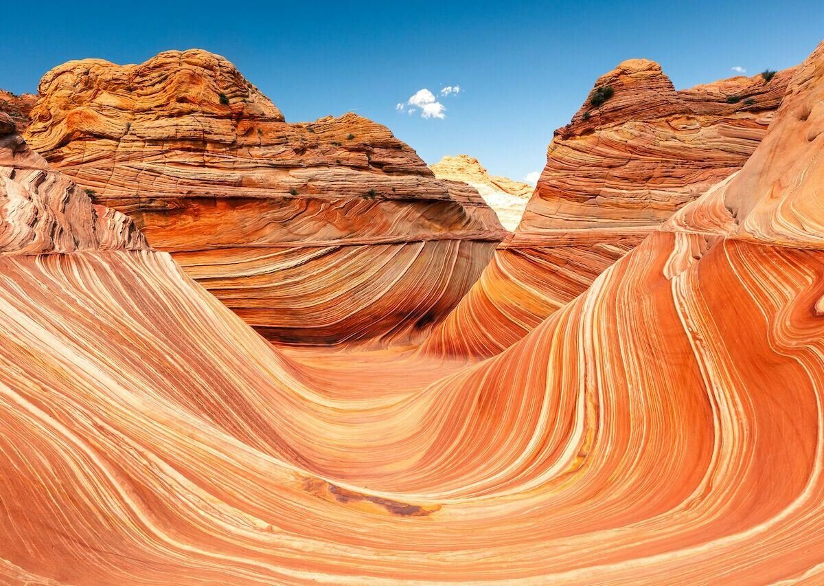 Слово "волна" в названии этого чуда природы не имеет ничего общего с водой, хотя именно древний океан и привел к образованию этой геологической формации. Плавность линий жгучего оранжевого песчаника завораживает. Они не переплетаются между собой, а гибкими округлыми пучками расходятся в разных направлениях. Волны окружают путешественника со всех сторон. Они под ногами, сбоку, впереди и сзади. Их так много, что начинает двоиться в глазах, а от оптической иллюзии кружится голова и становится дурно. Волн нет только наверху, зато с пронзительно-голубого неба яростно печет солнце, усиливая ощущение накатывающей дурноты.