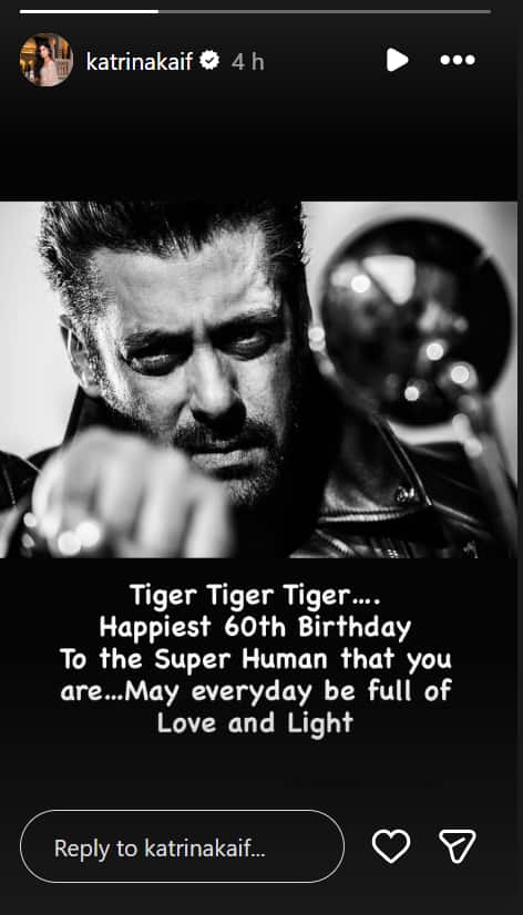 Newly turned mother and Bollywood actress Katrina Kaif wished Salman Khan on his 60th birthday. While sharing a monochrome photo of Salman, the actress called the superstar 'a superhuman'. It is a well-known fact that Salman and Katrina share a long history of personal and professional bond over the decades. The two have been friends for a very long time. Like every year, this time too, she shared a special post for Khan. While sharing a post on her Instagram stories, Katrina Kaif wrote, "Tiger Tiger Tiger....Happiest 60th Birthday To the Super Human that you are...May everyday be full of Love and Light."
