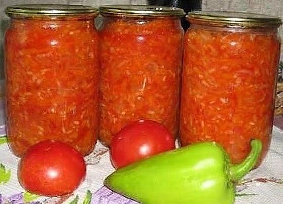 Потребуется:5 кг сладкого перца порезать на 4-6 частей, 15-16 морковок среднего размера натереть на средней терке. 3 кг помидоров пропустить через мясорубку, 2 головки чеснока пропустить через пресс или пропустить через мясорубку вместе с помидорами, 1 пучок петрушки мелко порубить.