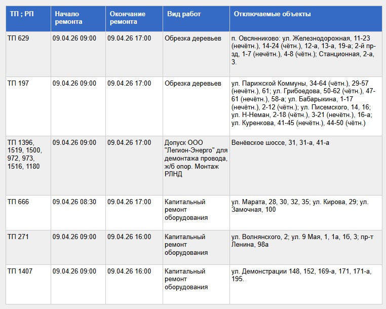 Полный список адресов и график отключений представлены ниже: