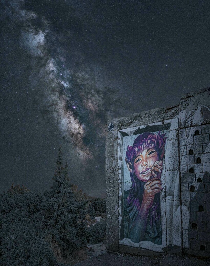 Daniel Viñé GarciaРисунок Пандоры от уличного художника и Млечный Путь на пляже в Греции