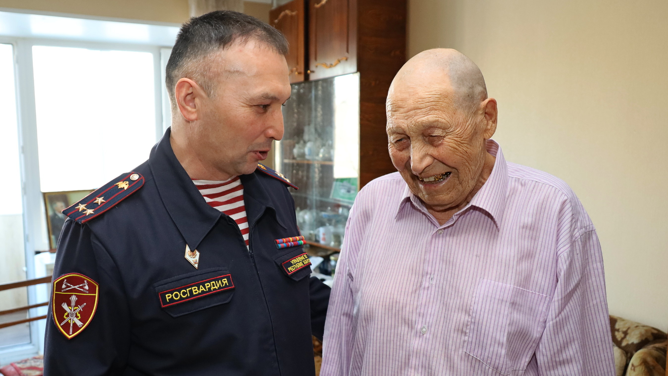 В рамках празднования 10-летия со дня образования Росгвардии и 215-й годовщины войск правопорядка заместитель начальника Управления Росгвардии по Республике Татарстан полковник полиции Рафил Набиуллин поздравил с профессиональным праздником двух участников Великой Отечественной войны - ветеранов вневедомственной охраны.