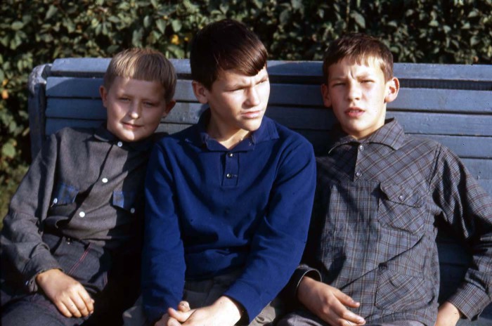 Мальчики, сидящие на лавочке в сквере Кирова. СССР, 1969 год.