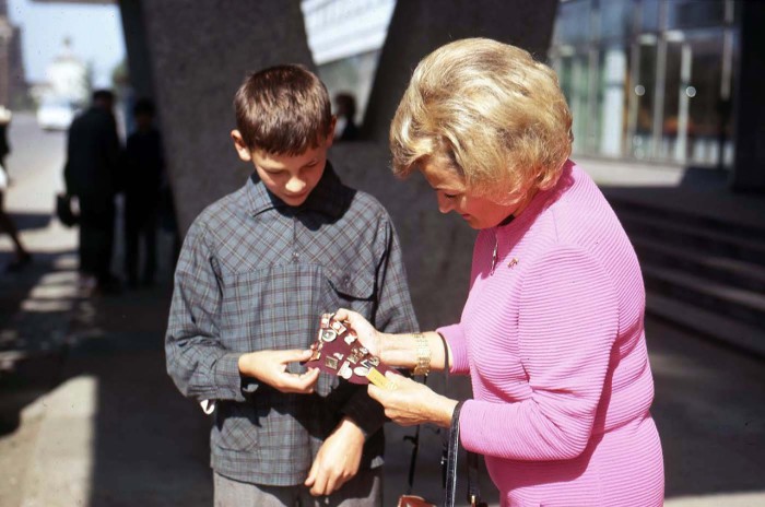 У входа в гостиницу Ангара Мальчик предлагает женщине значки с изображением Ленина. СССР, 1969 год.
