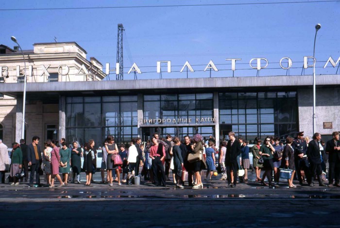 Толпы людей возле пригородных касс на вокзале в Иркутске. СССР, 1969 год.