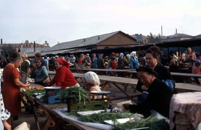 Женщины, торгующие зеленью на Иркутском рынке. СССР, 1969 год.