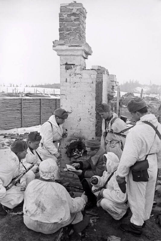 Советские бойцы в маскировочных халатах отдыхают возле печной трубы разрушенного дома в Псковской области